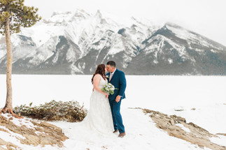 This gorgeous snowy wedding took place in April. Yes, this is what April weddings look like here in the Rockies... and I am obsessed! Lisa and Clayton's wedding took place at the Banff Rocky Mountain Resort; for their bridal portraits we headed to Lake Minnewanka, which is a stunning lake only 15 minutes outside the town of Banff. It was such a pleasure spending this beautiful April day with these two and their loved ones!